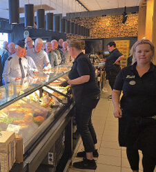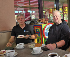 De busreis verloopt voorspoedig, onderweg wordt koffiegedronken bij Bäckerei Hensel in Hiddenhausen, net zoals vorig jaar.