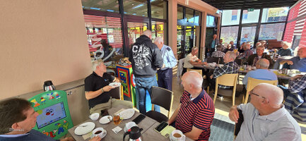 Op weg naar huis hebben we onderweg nog koffie met gedronken. Onze chauffeurs laten het zich smaken. En Gé houdt een van zijn laatste praatjes.